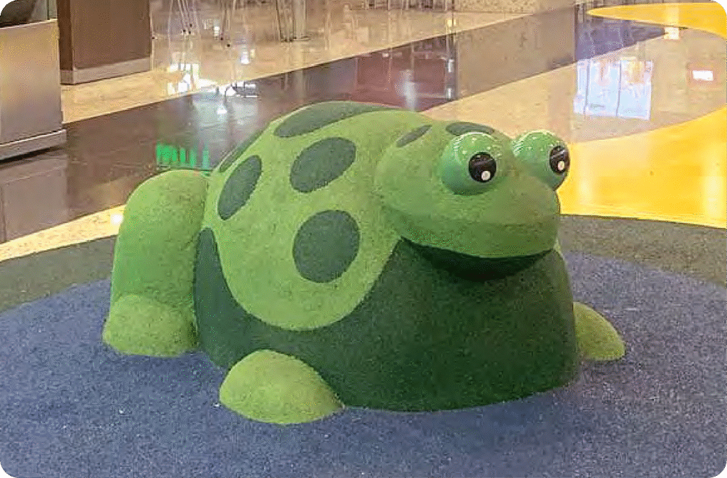 O Frog convida as crianças em um mundo de movimento e imaginação, enquanto pulam pelas lagoas da natureza. Projetada para espaços infantis indoor e outdoor, temáticos ou não. Pode ser usado com outros Animais 3d WiggleTodd.